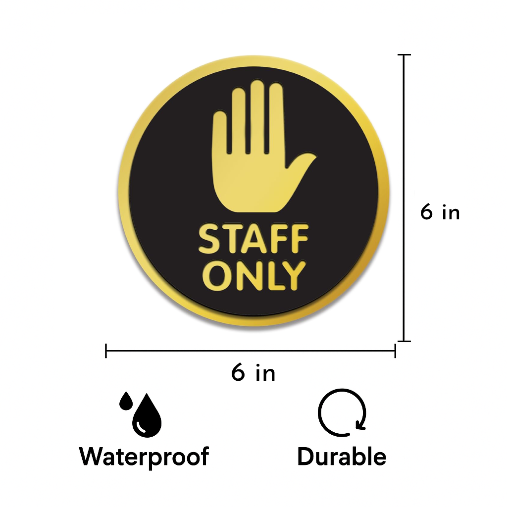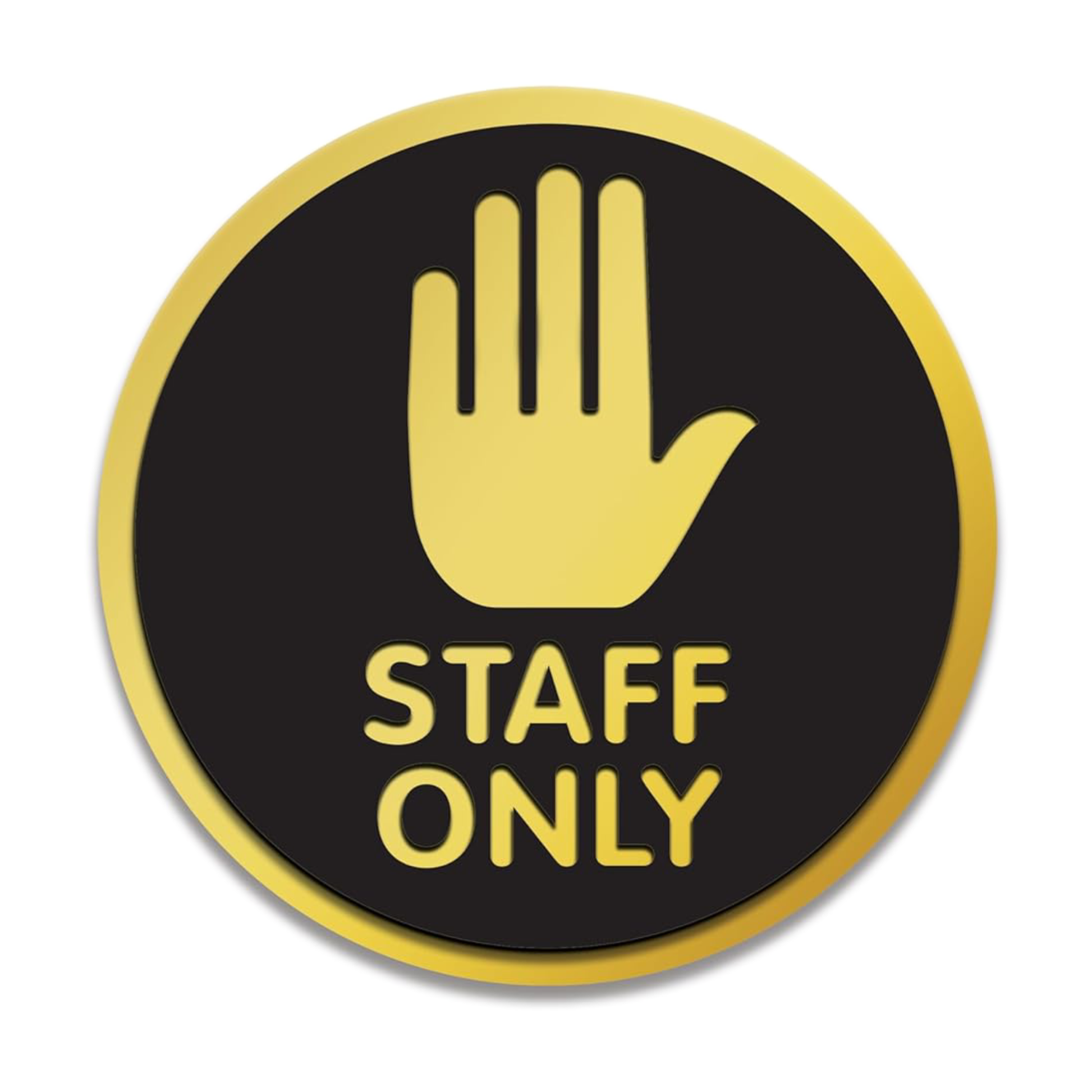 RESTRICTED ACCESS SIGN: 15.24 cm circular sticker with a hand stop icon and “STAFF ONLY” text in bold gold on black
