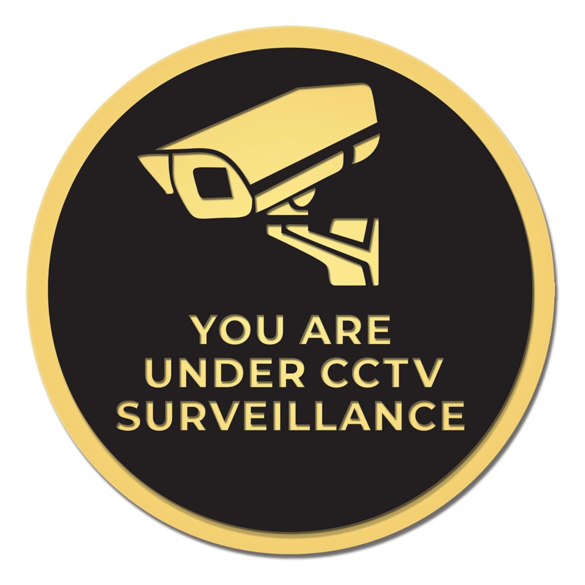 CLEAR SECURITY NOTICE: Stylish gold-on-black round design with bold CCTV camera graphic and clear warning message