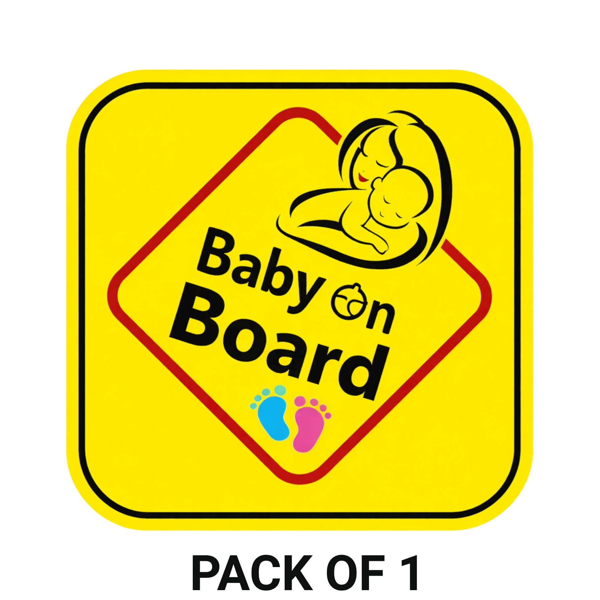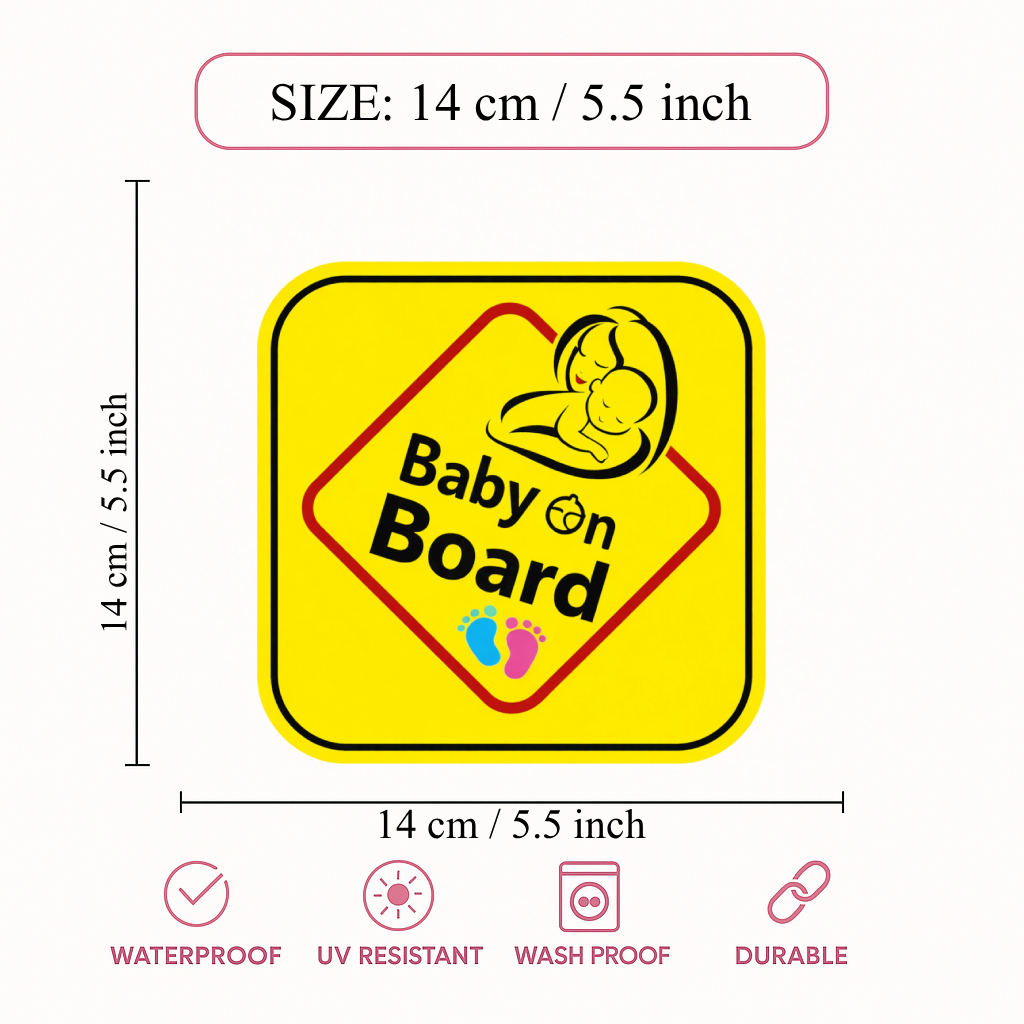 CLEAR BABY ON BOARD SAFETY MESSAGE – Bright yellow “Baby on Board” design with cute baby illustration alerts other drivers to drive carefully and maintain safe distance.