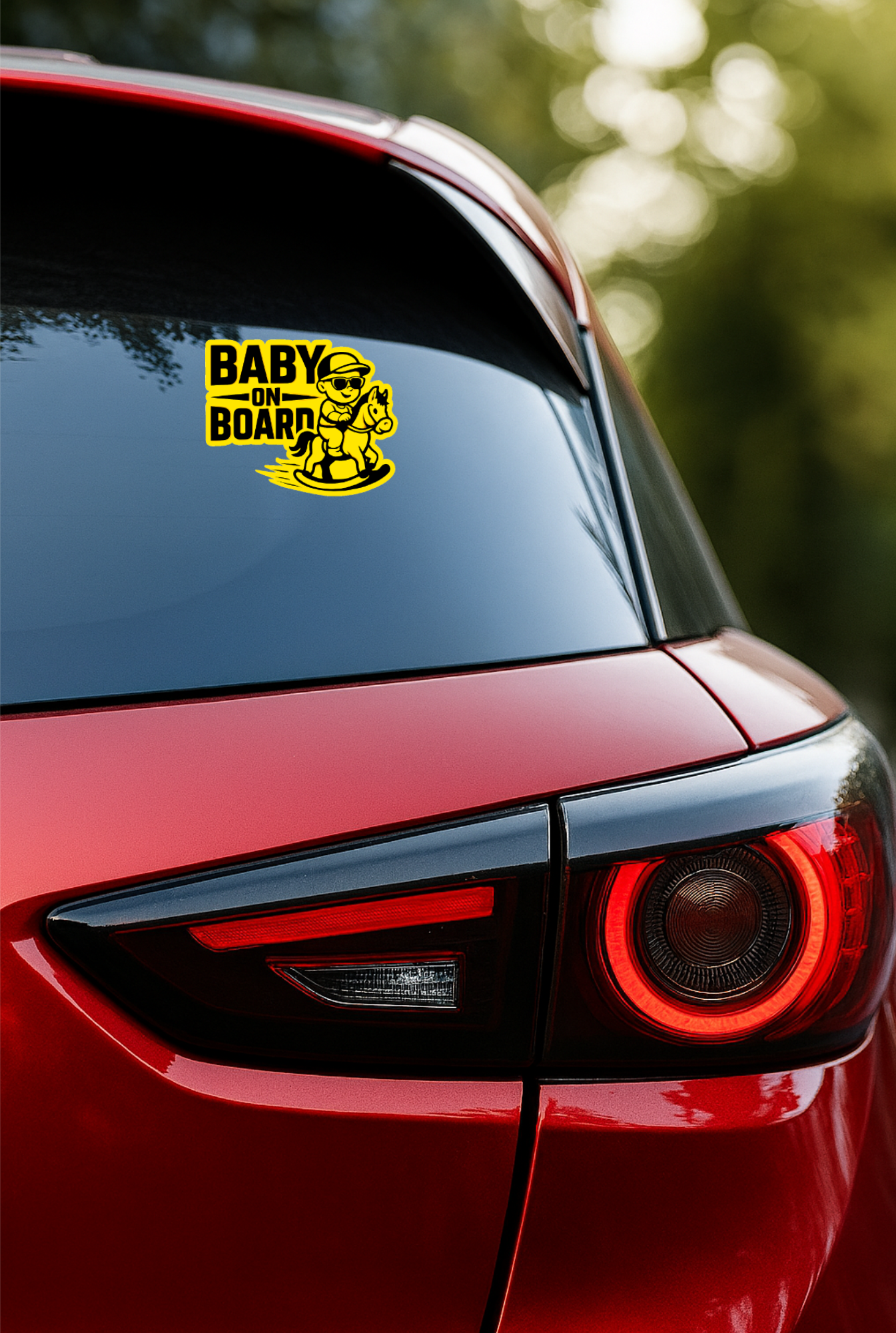 UNIQUE HORSE RIDING DESIGN – Features a cool baby wearing sunglasses and riding a rocking horse, creating a fun yet attention-grabbing safety message for vehicles.