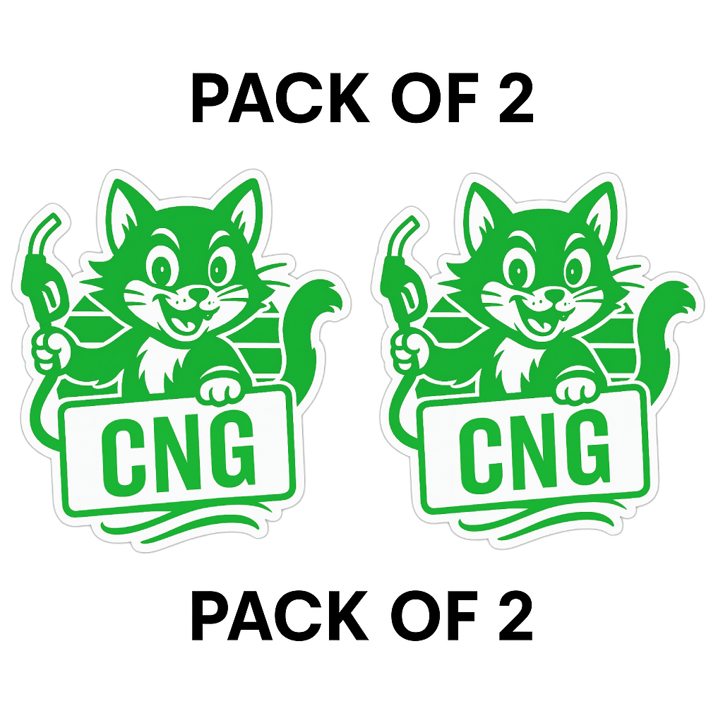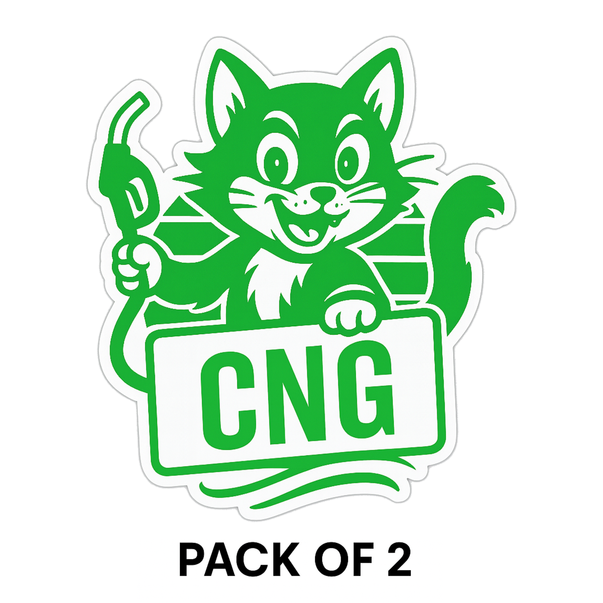 ADORABLE CNG THEME DESIGN – Features a cheerful green cartoon cat holding a fuel nozzle with a bold “CNG” board, making fuel-type identification fun and eye-catching.