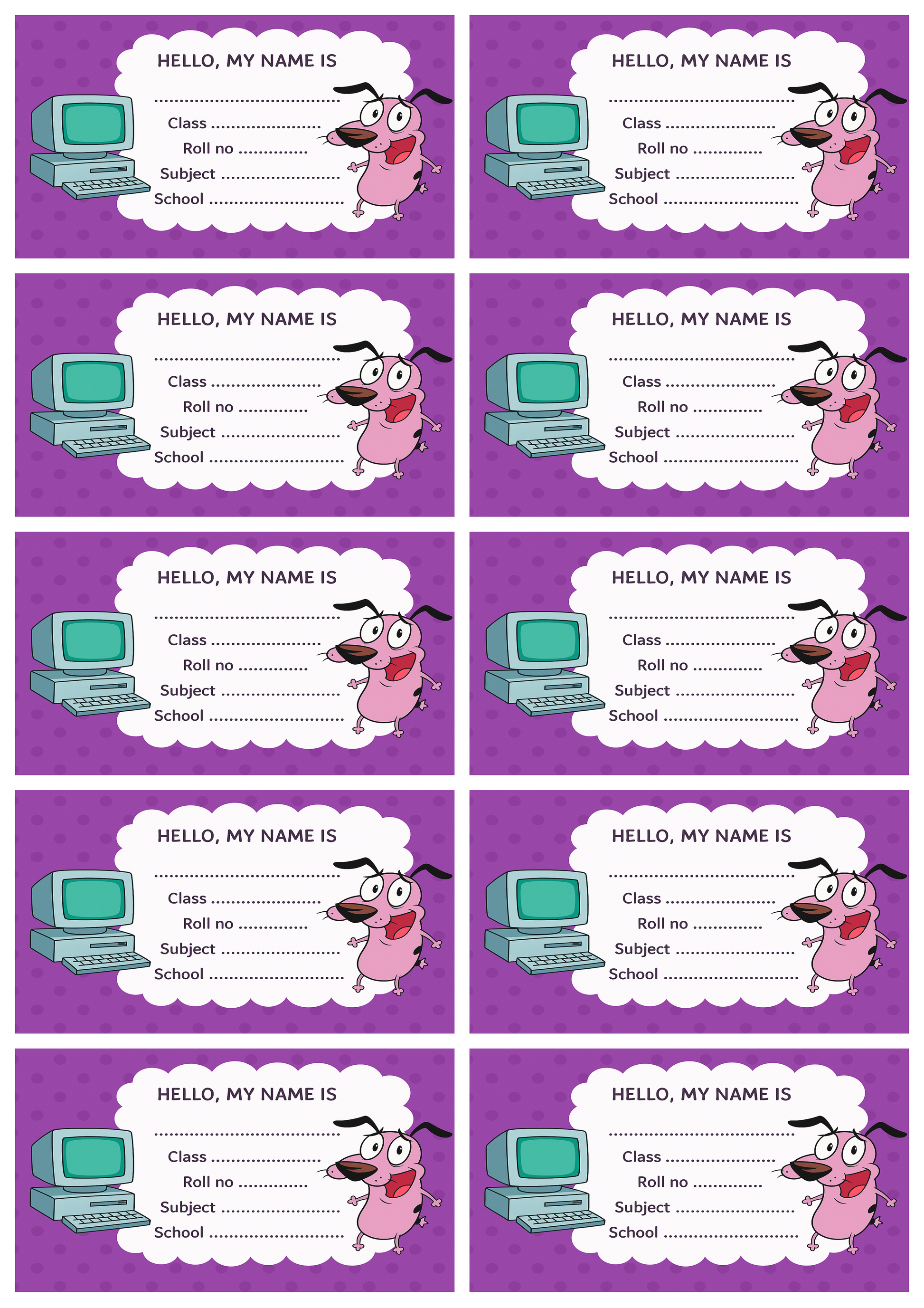 KEEP YOUR CHILD’S BOOKS ORGANISED – These 3.5 x 2 inch school labels feature a bright purple background with a fun Courage Dog and Computer cartoon theme, making them perfect for school books, notebooks, journals, and project files.