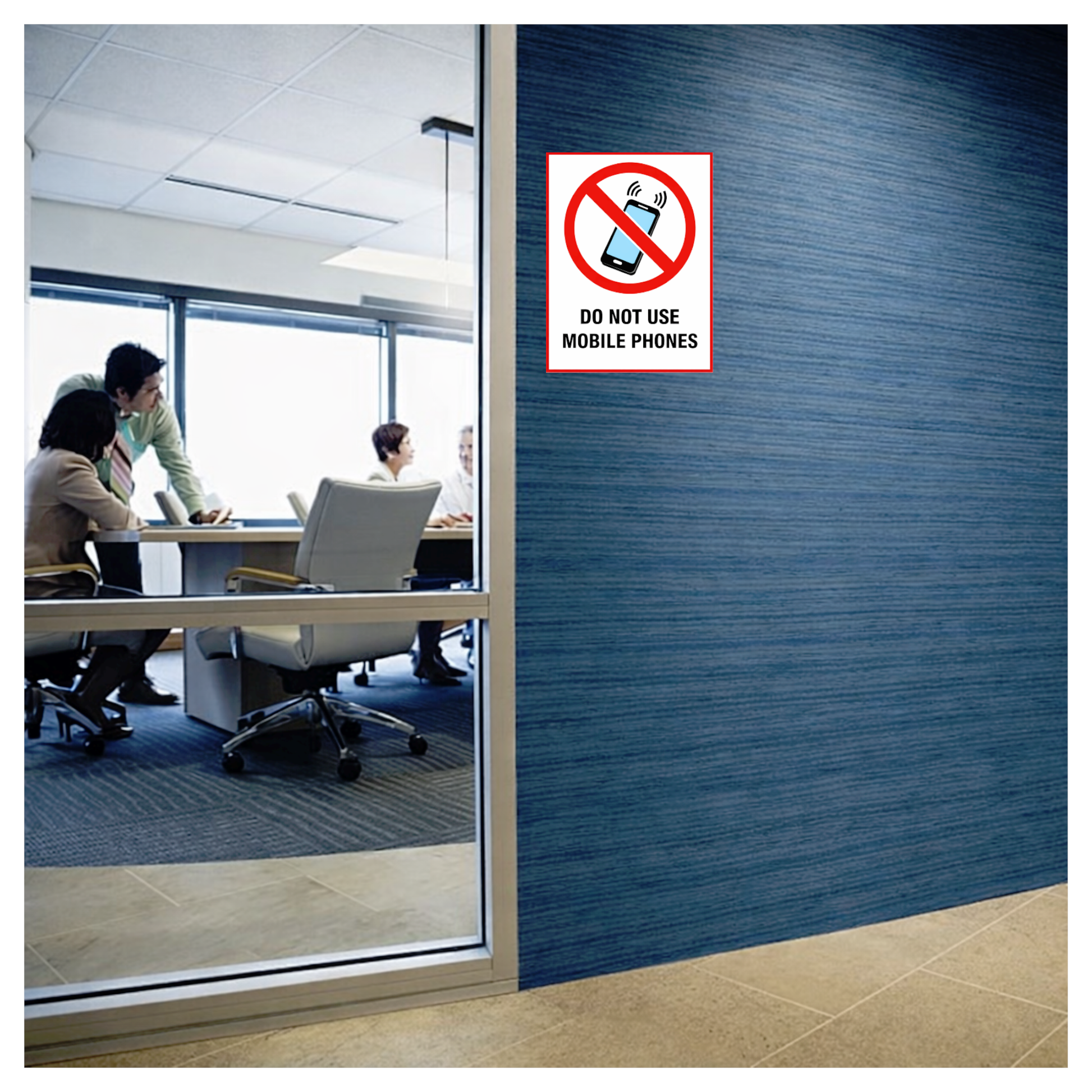 CLEAR NO MOBILE PHONE WARNING – Features a universal no-mobile symbol with crossed-out smartphone icon and bold “DO NOT USE MOBILE PHONES” text for instant understanding and compliance.