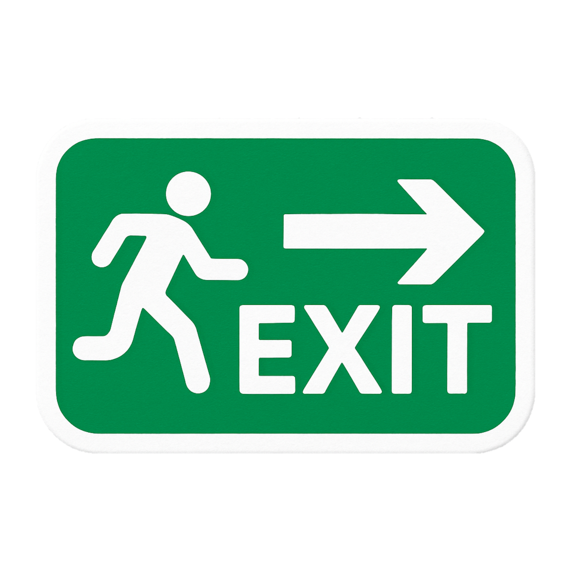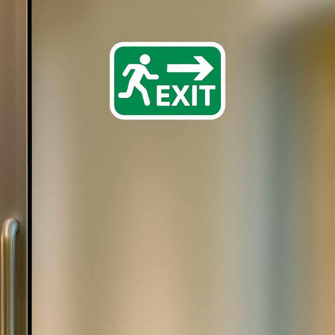 CLEAR EMERGENCY SIGN – Features a running man symbol with a bold right-arrow EXIT direction for fast and easy identification during emergencies.