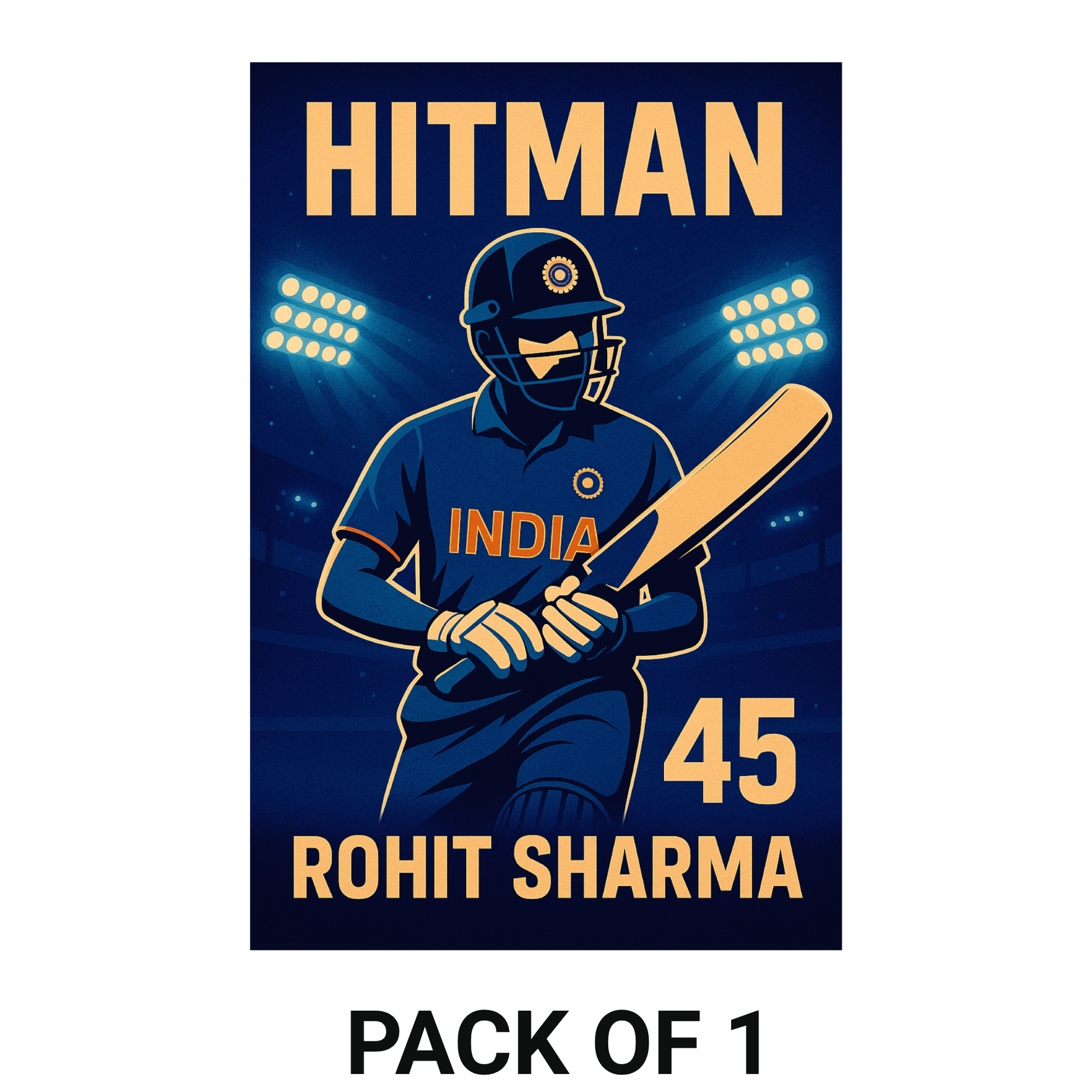 POWERFUL CRICKET POSTER DESIGN – Features a bold illustrated batsman with the text “HITMAN”, “ROHIT SHARMA”, and jersey number 45, set in a dramatic stadium lighting background ideal for cricket enthusiasts.