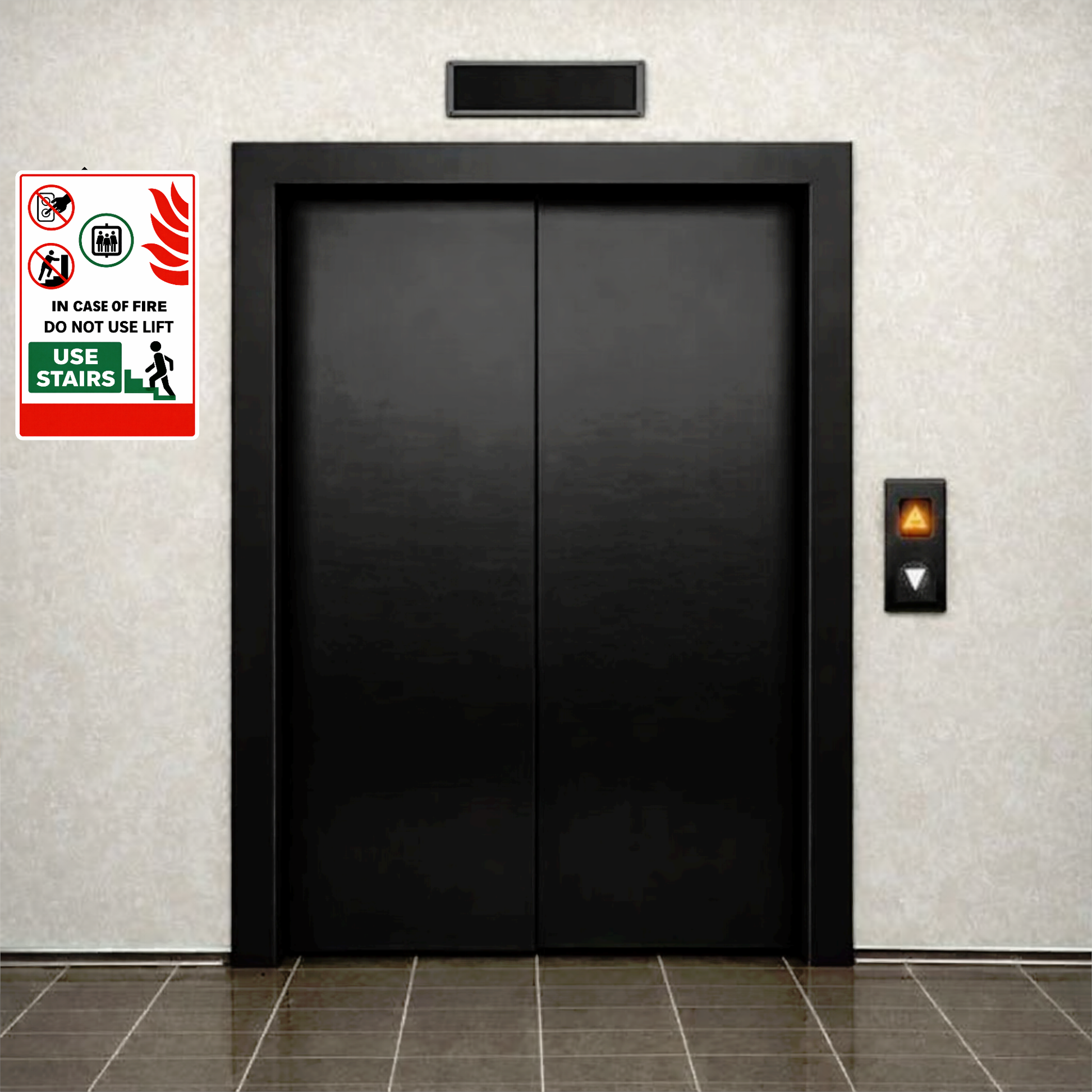 HIGH-VISIBILITY SAFETY GRAPHICS – Includes lift prohibition icons, stair direction symbol, and fire hazard graphic to ensure quick response during emergencies.