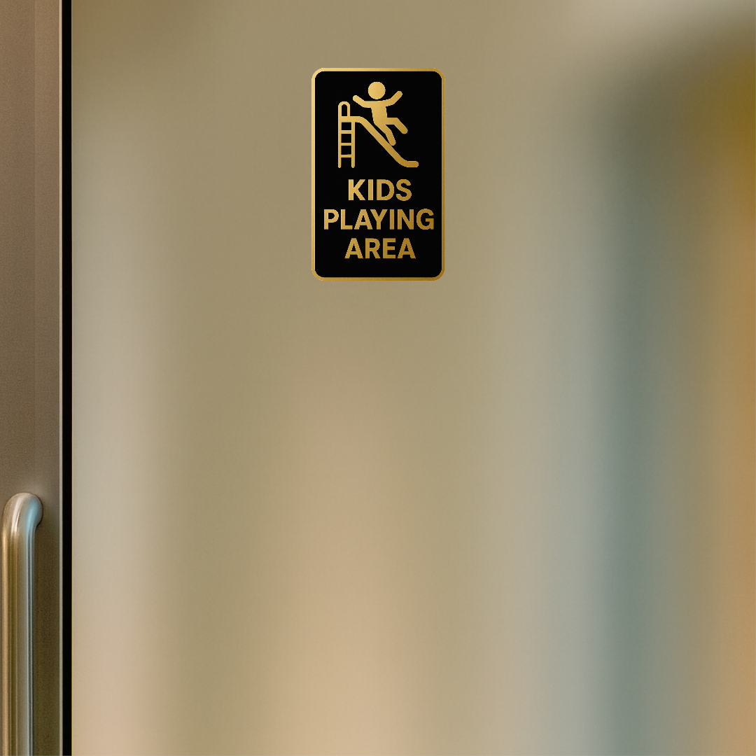 CLEAR SAFETY SIGNAGE FOR CHILDREN’S ZONES – Features a gold slide icon with a child figure and bold “KIDS PLAYING AREA” text, ensuring everyone easily identifies child-friendly zones.
