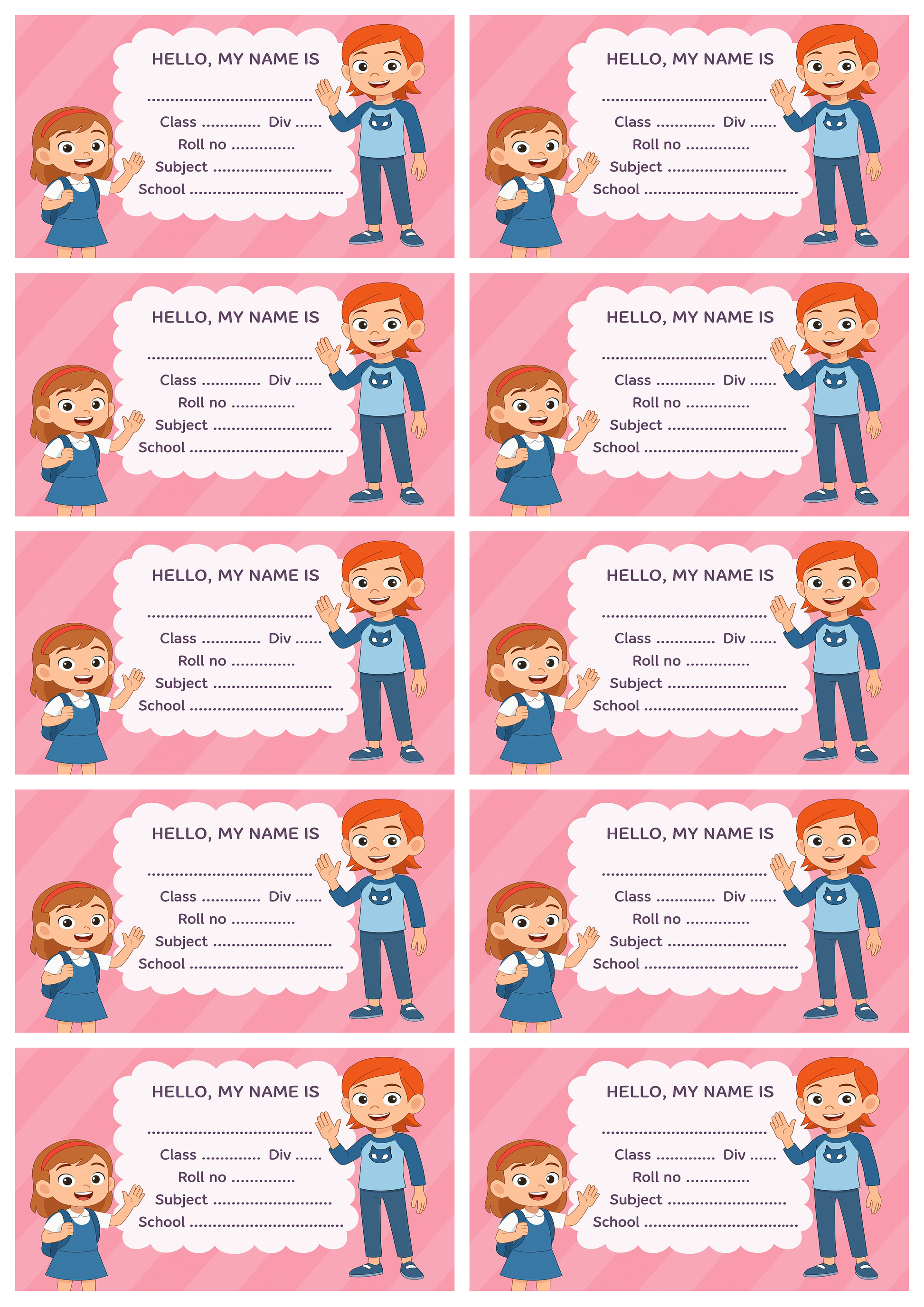 CUTE SCHOOL LABEL DESIGN – Features a friendly girl illustration with a soft pink striped background for a cheerful school look.
