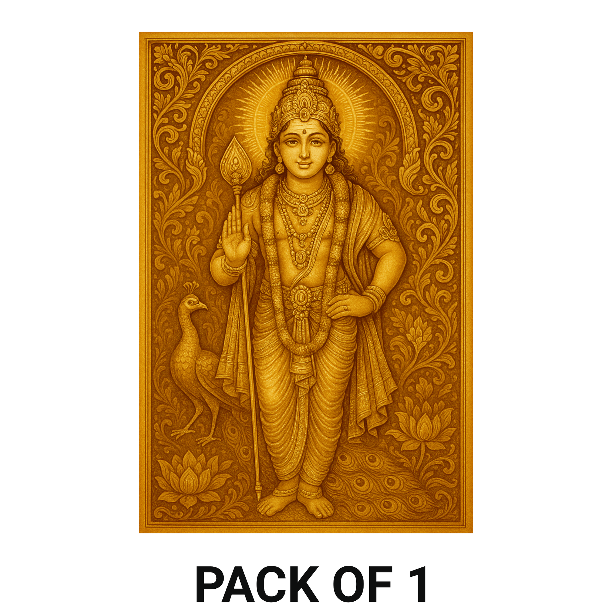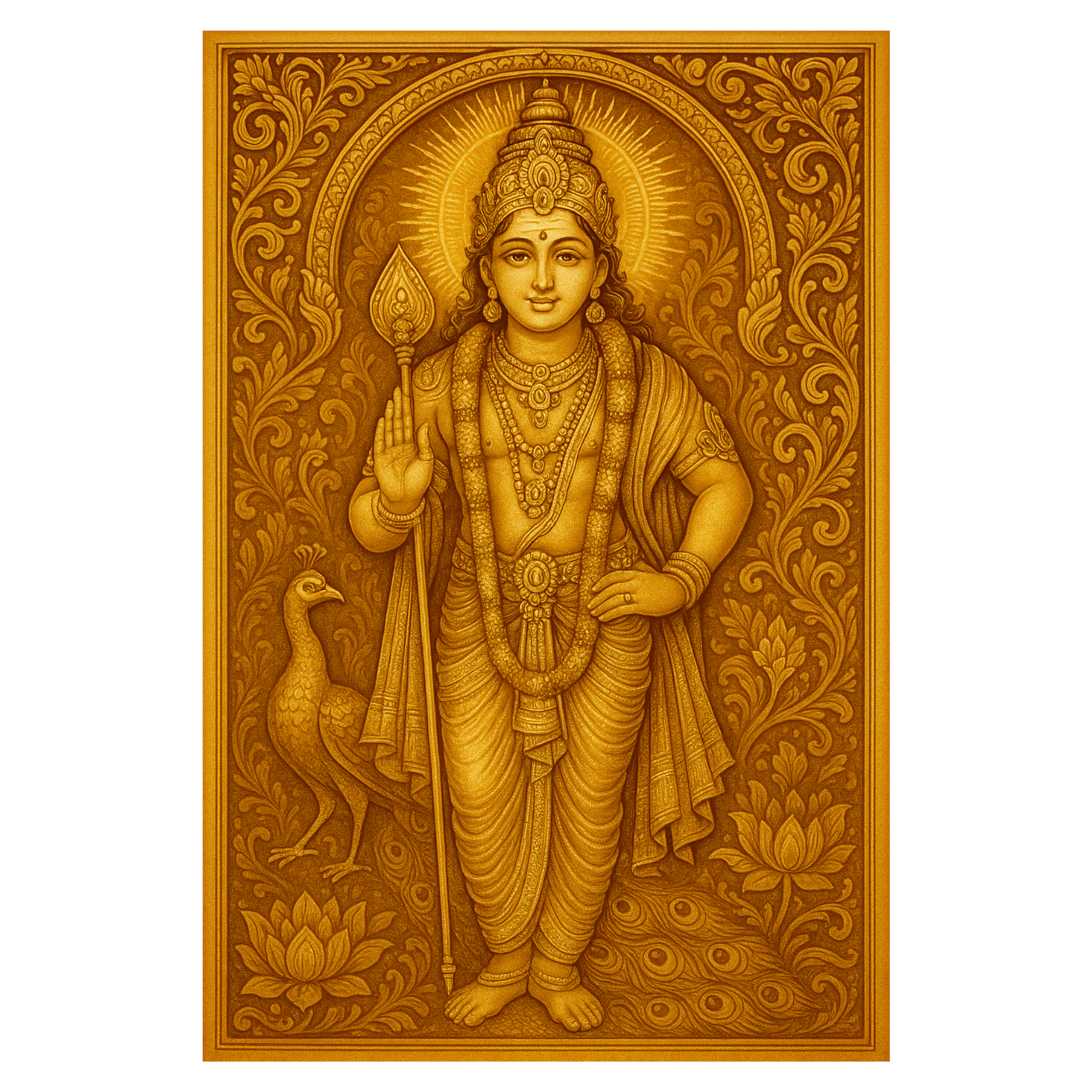 DIVINE LORD MURUGAN ARTWORK – Features a stunning golden depiction of Lord Murugan holding the Vel, accompanied by his sacred peacock, symbolizing protection, wisdom, and spiritual strength.