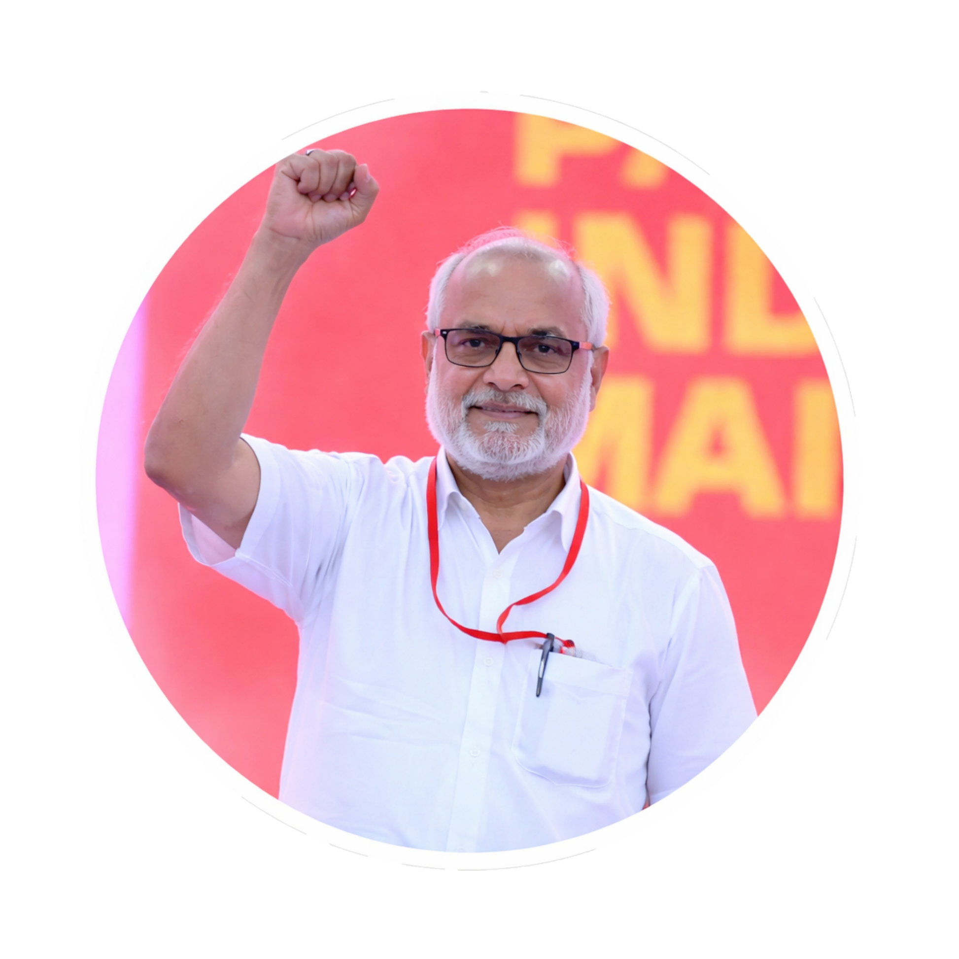 M A BABY POLITICAL PORTRAIT DESIGN – Features a high-quality image of M. A. Baby with a raised fist pose, symbolizing leadership, unity, and commitment to people’s movements and leftist ideology.