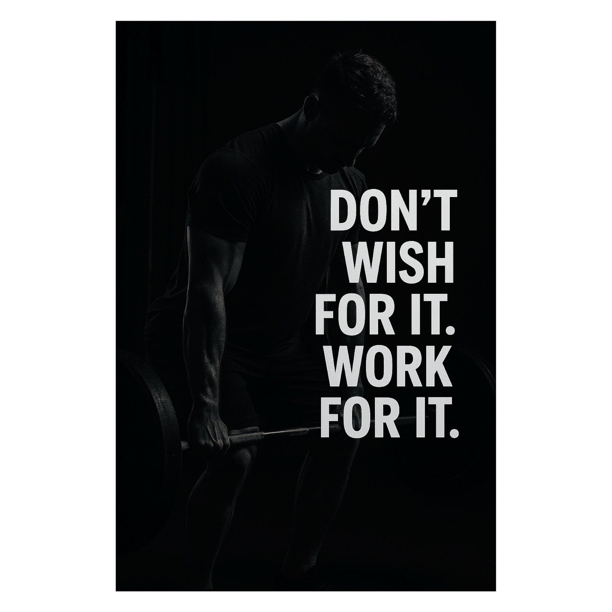 POWERFUL MOTIVATIONAL QUOTE DESIGN – Features a bold “Don’t Wish For It, Work For It” message over a strong gym-themed background, inspiring discipline, focus, and daily workout commitment.