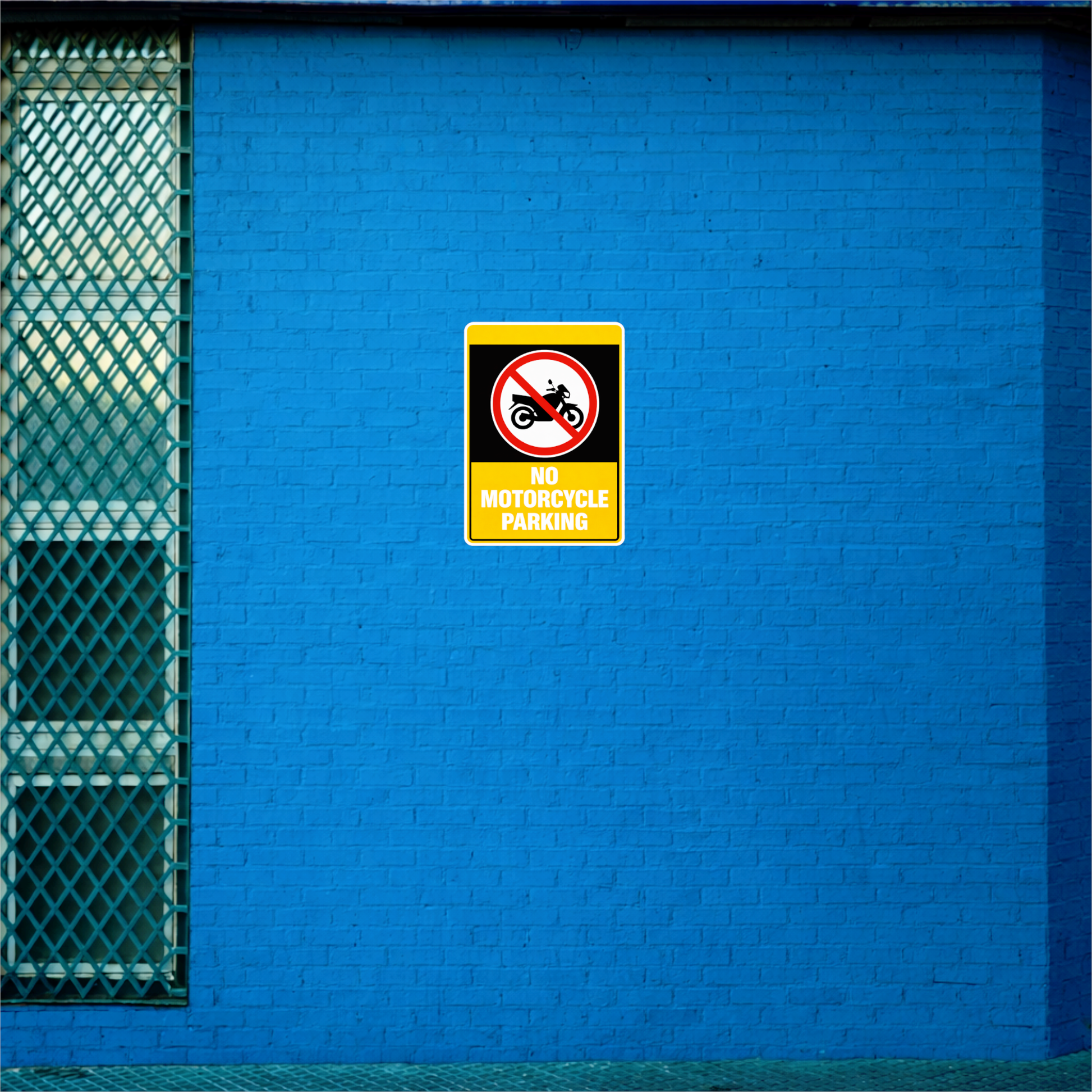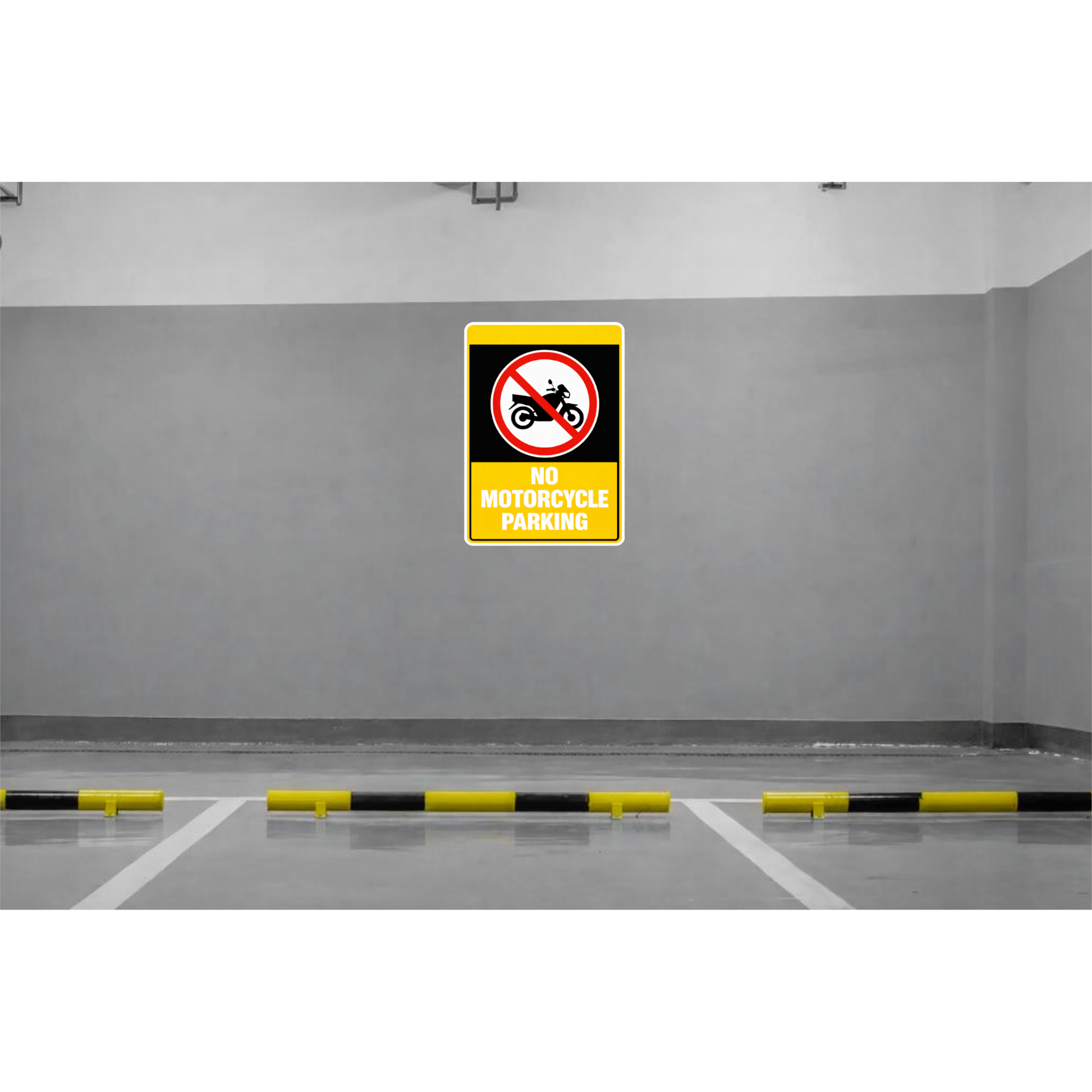 CLEAR NO MOTORCYCLE PARKING DESIGN – Features a bold yellow and black warning-style layout with a crossed motorcycle symbol and “No Motorcycle Parking” text for instant visibility and compliance.