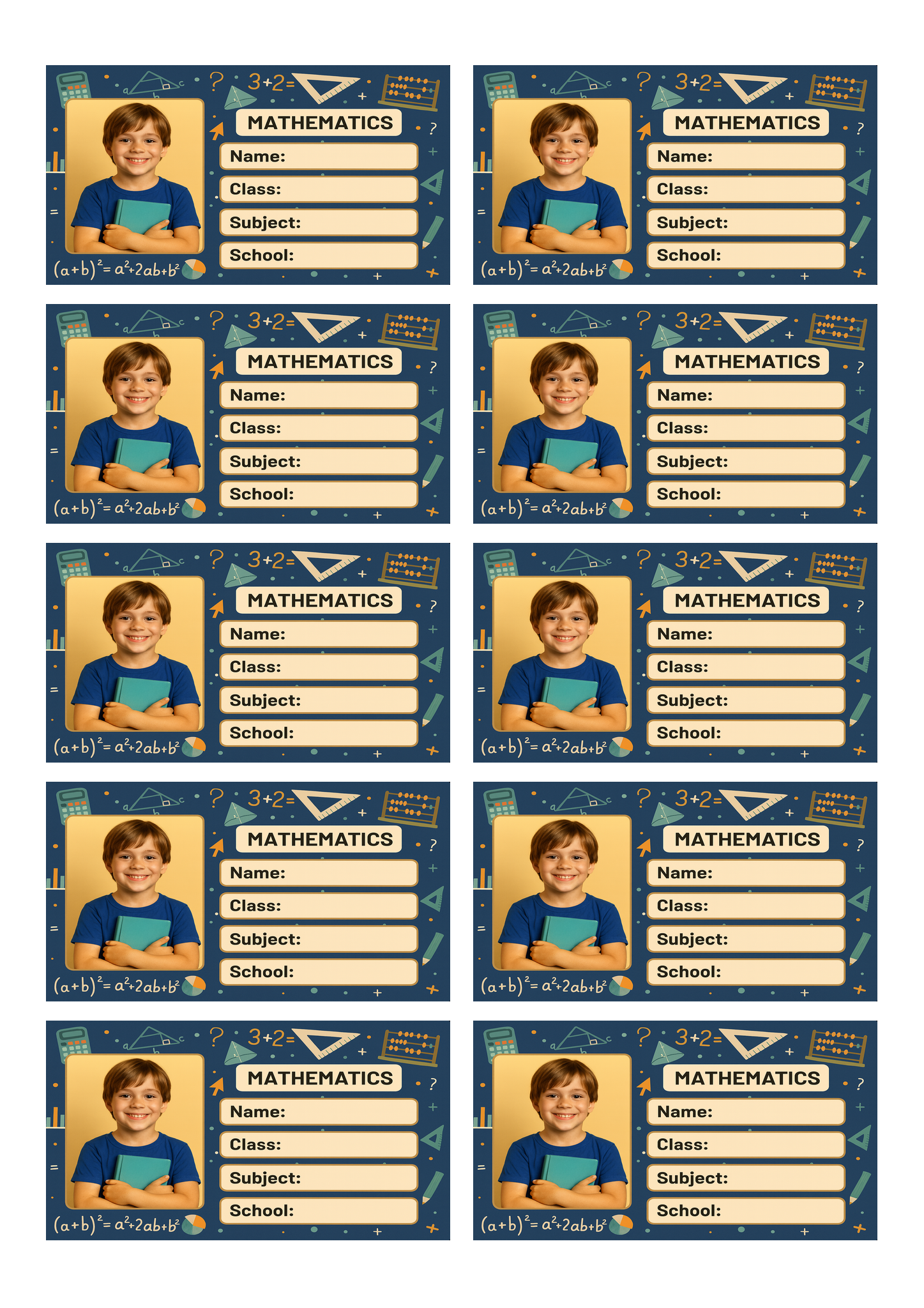 Each sheet comes with 10 beautifully designed mathematics-themed personalized labels, perfect for organizing school materials.