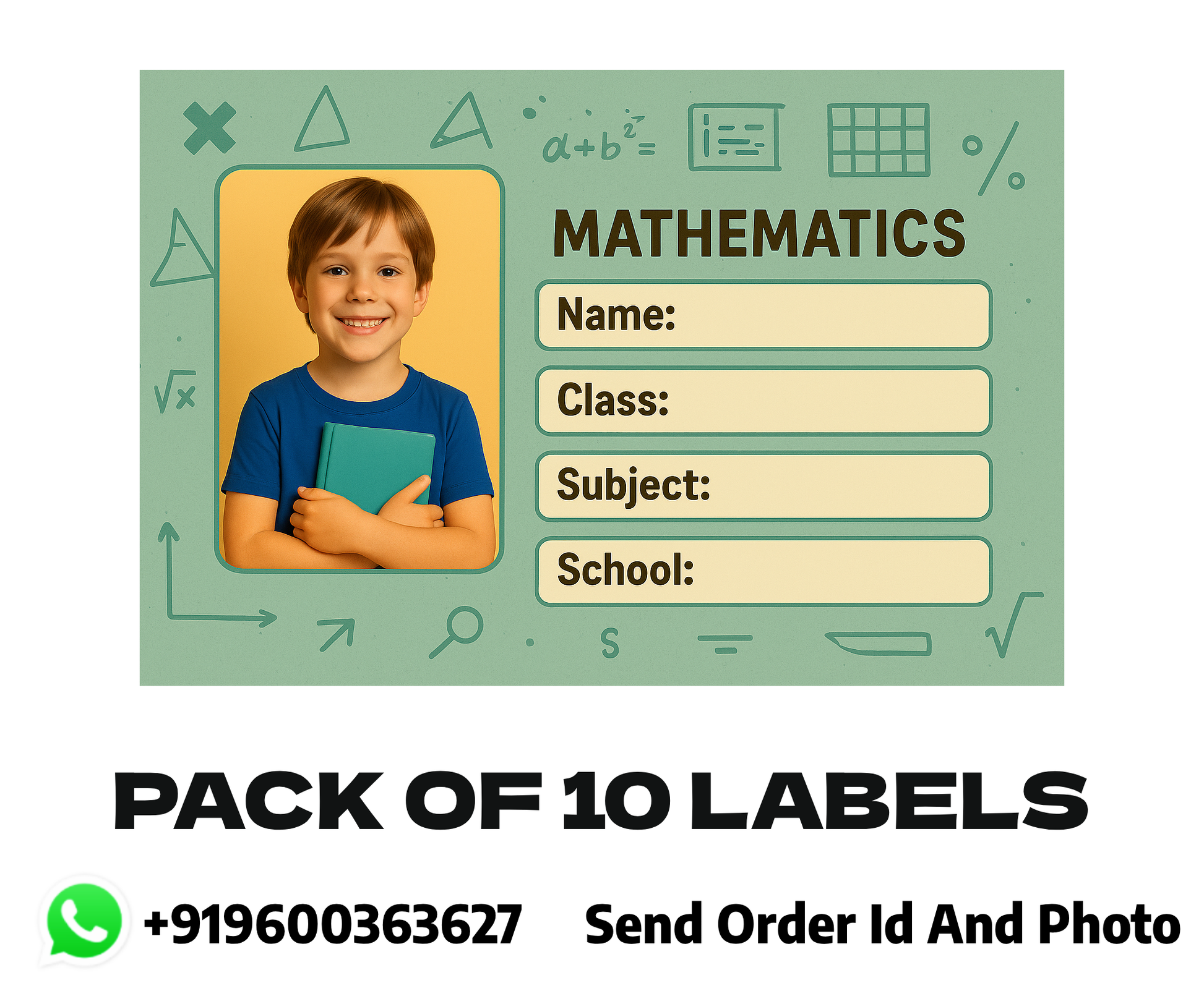 Premium-quality mathematics-themed name stickers featuring your child’s photo with dedicated fields for Name, Class, Subject, and School, helping students keep their notebooks clearly labeled and well-organized.