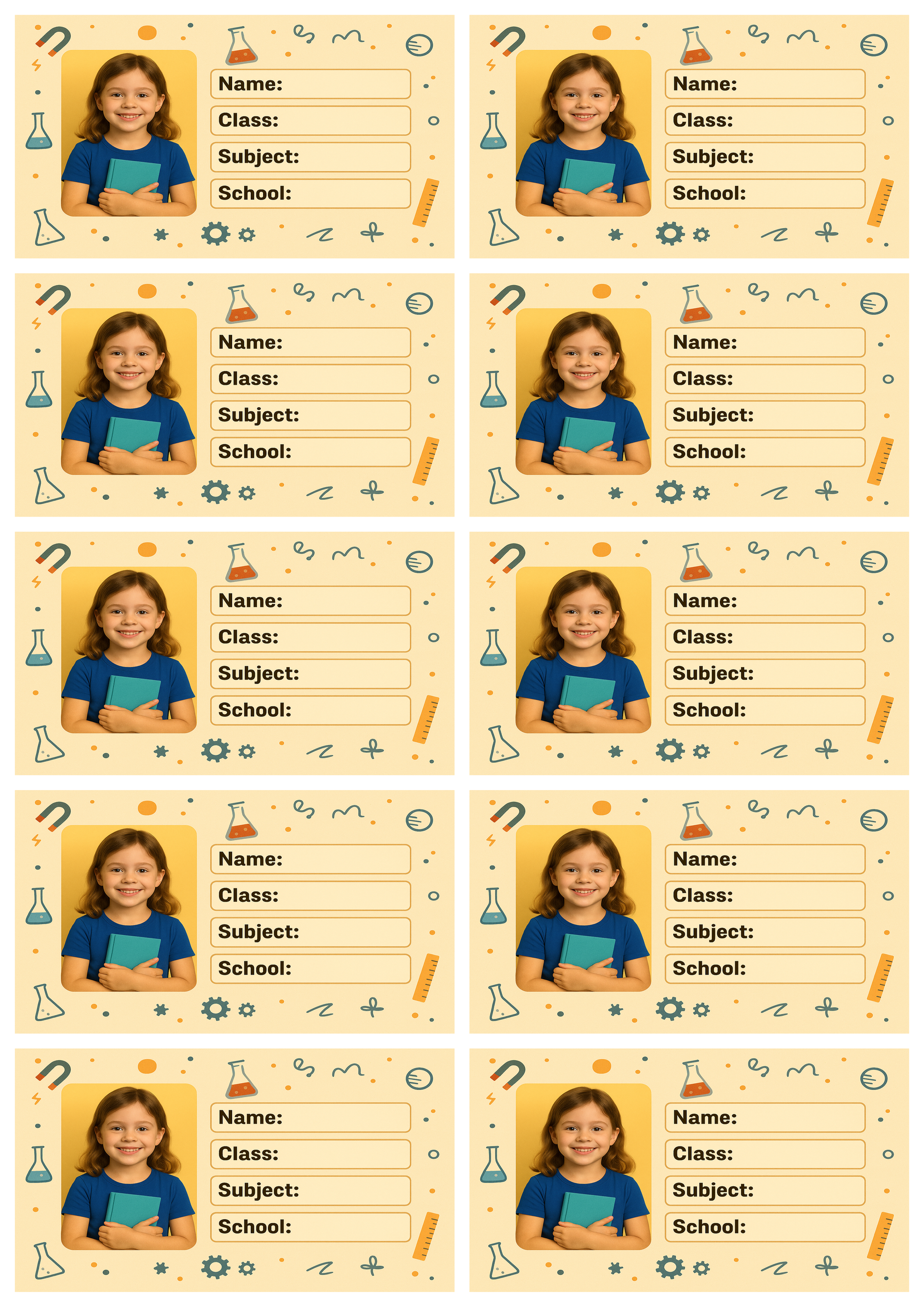 PERSONALIZED STUDENT BOOK LABELS – Specially designed customizable labels featuring your child’s photo with editable fields for Name, Class, Subject, and School, making every notebook neatly organized and easy to identify.