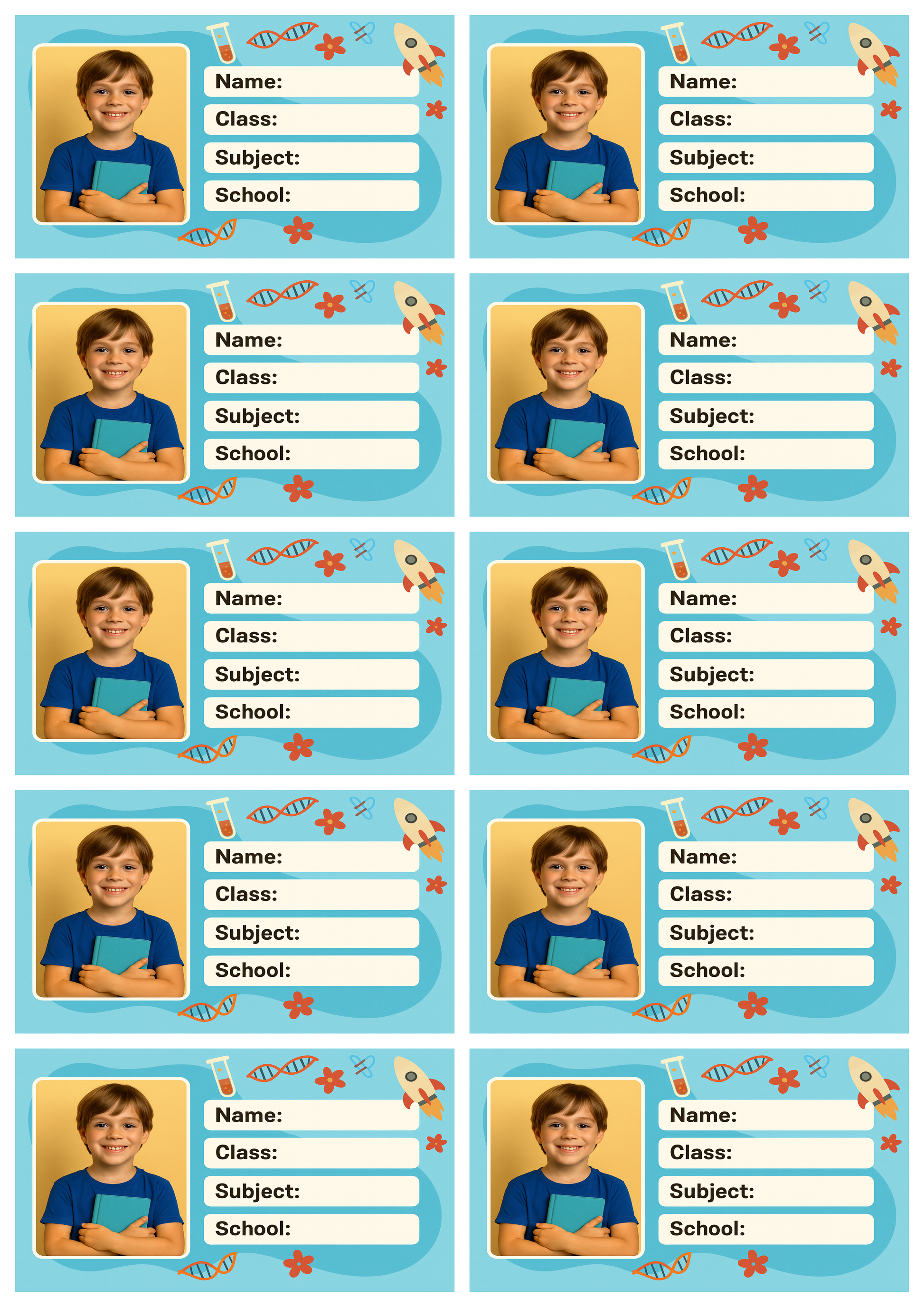 PERSONALIZED STUDENT LABELS – Premium custom school labels featuring your child’s photo with fields for Name, Class, Subject, and School. Perfect for easy identification of notebooks and stationery.