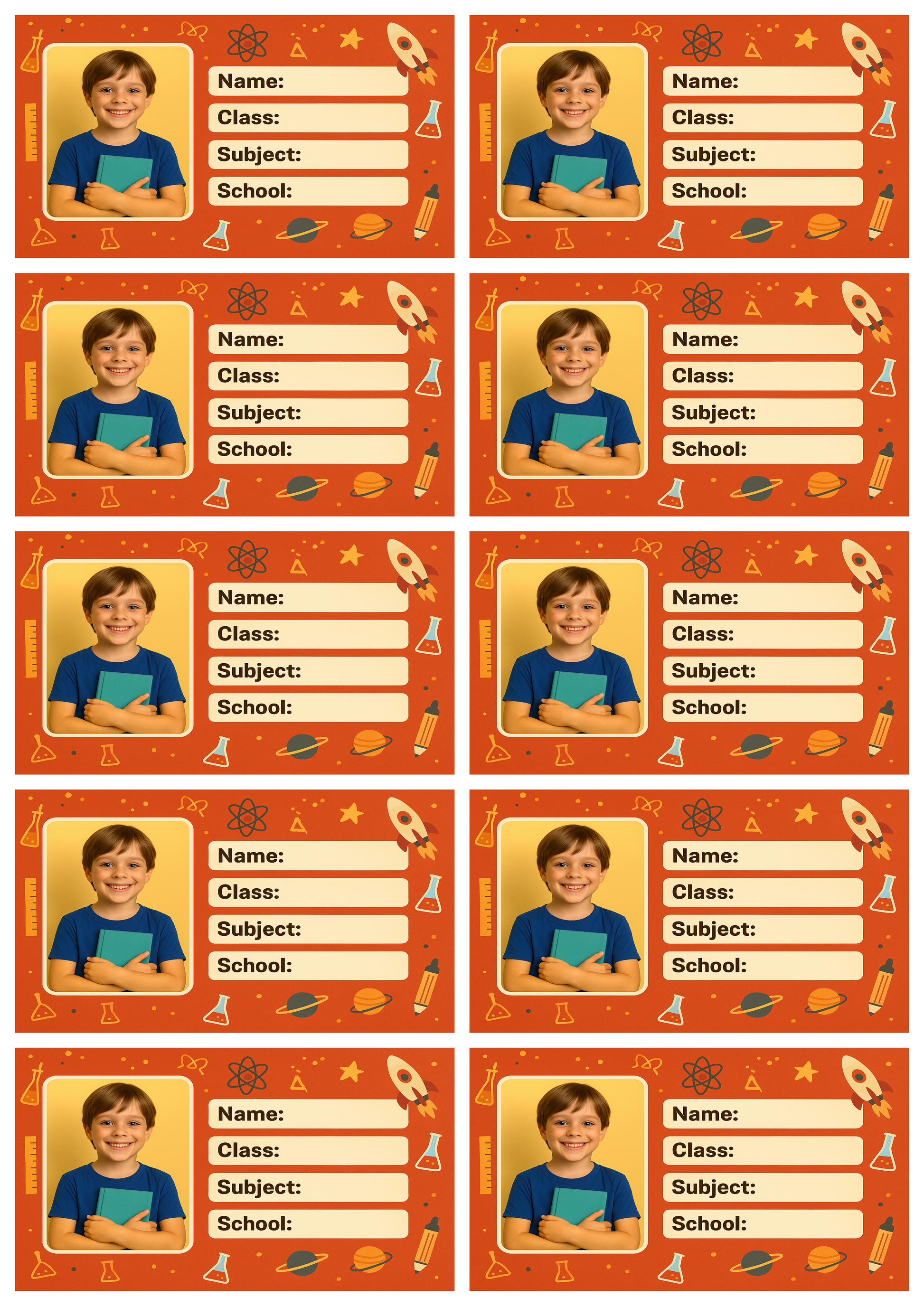 PERSONALIZED STUDENT LABELS – Premium-quality custom name stickers featuring your child’s photo along with fields for Name, Class, Subject, and School, ensuring clear identification on all school books.