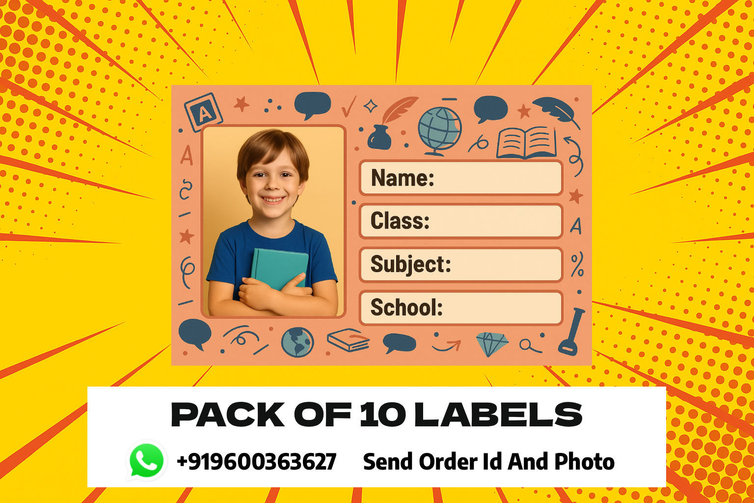 PERSONALIZED STUDENT LABELS – Premium custom school labels featuring your child’s photo along with Name, Class, Subject, and School fields, ensuring every notebook is clearly identified and neatly organized.