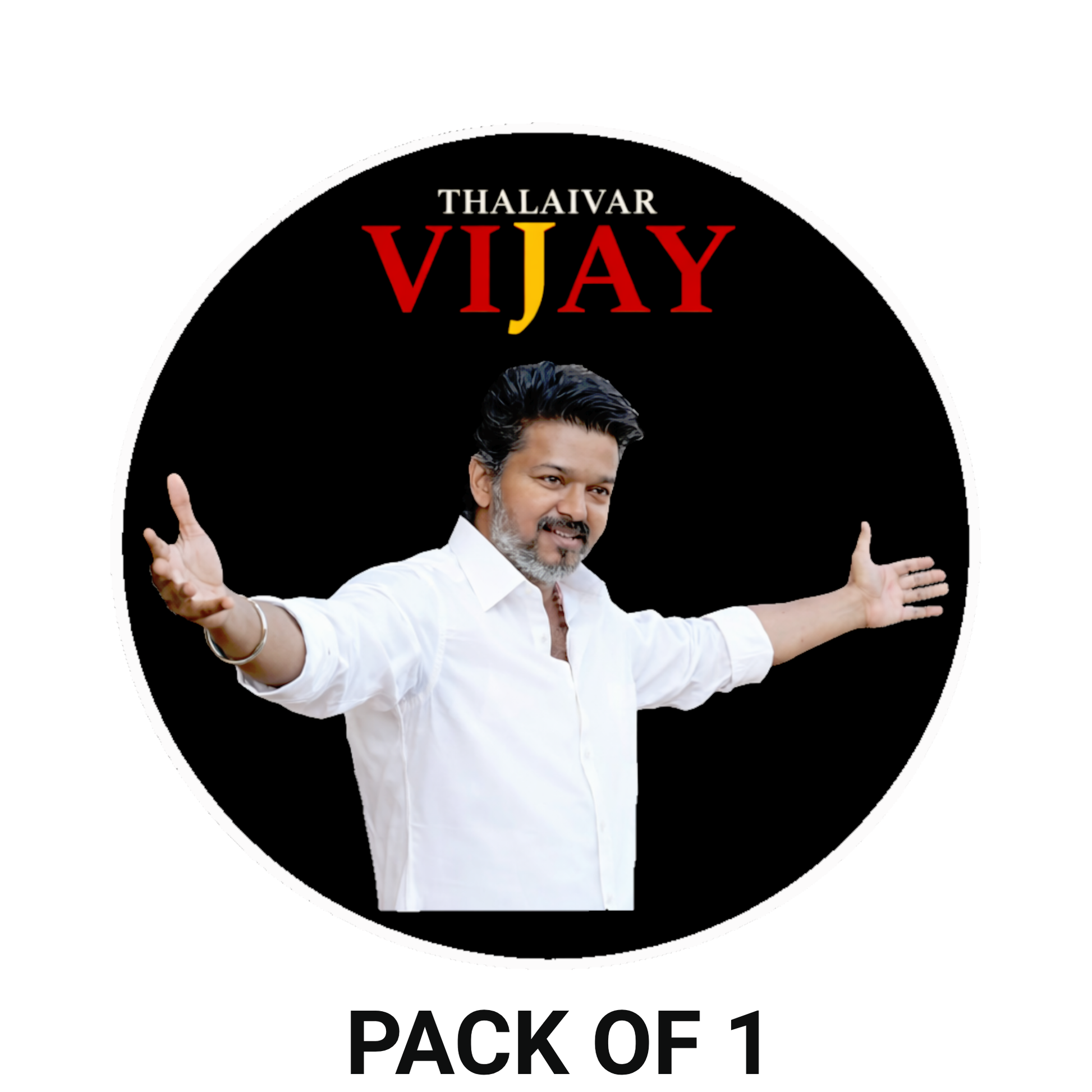ICONIC THALAIVAR VIJAY DESIGN – Features a bold circular sticker with deep black background, Vijay’s open-arms pose, and stylish “THALAIVAR VIJAY” text, delivering a powerful and charismatic visual appeal.