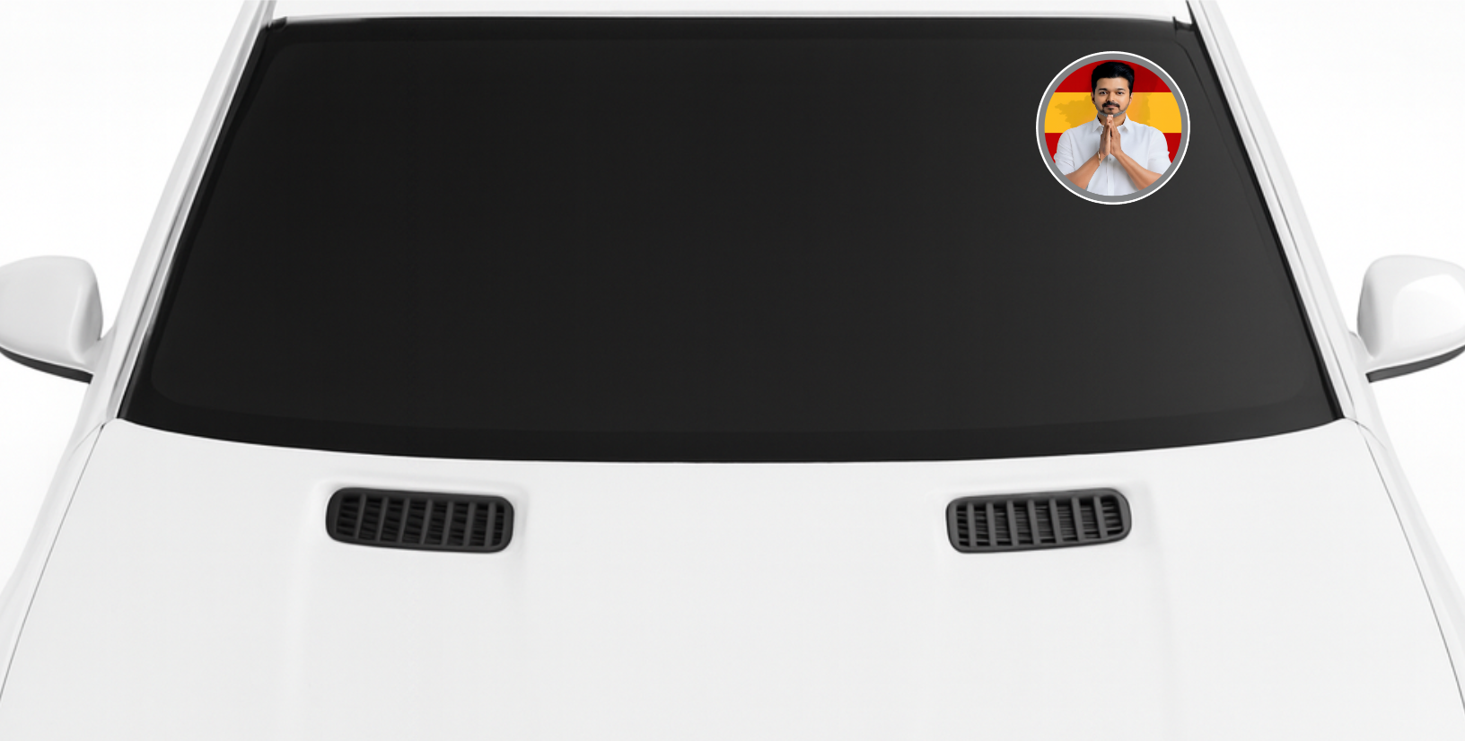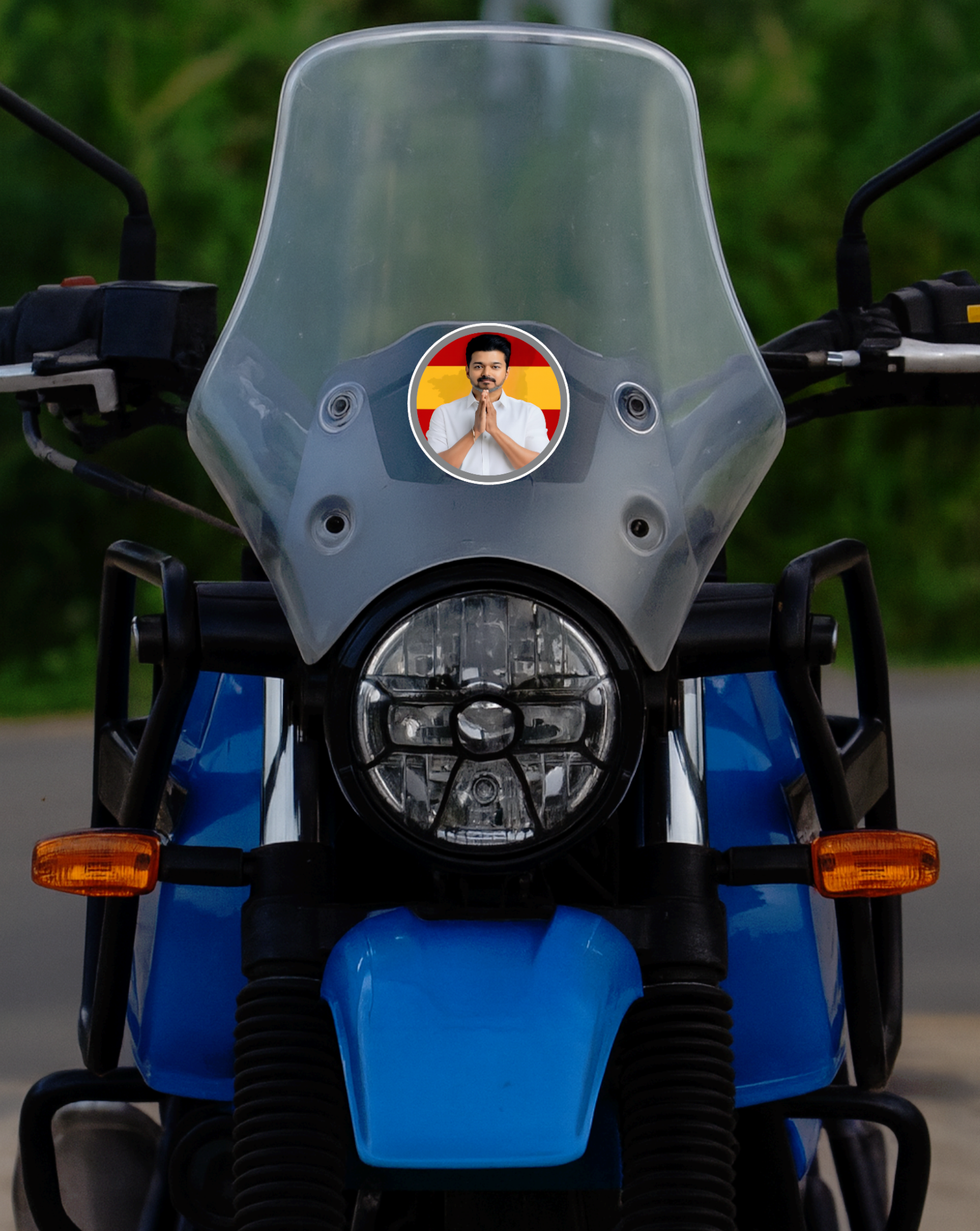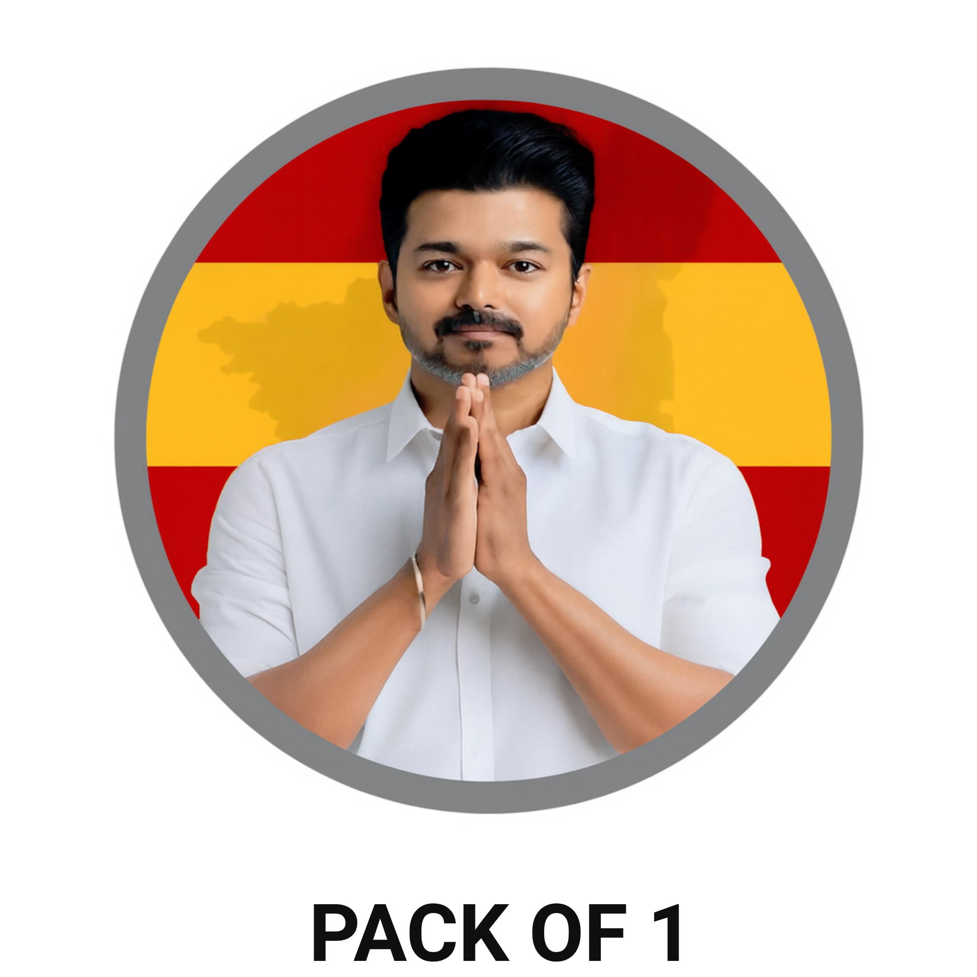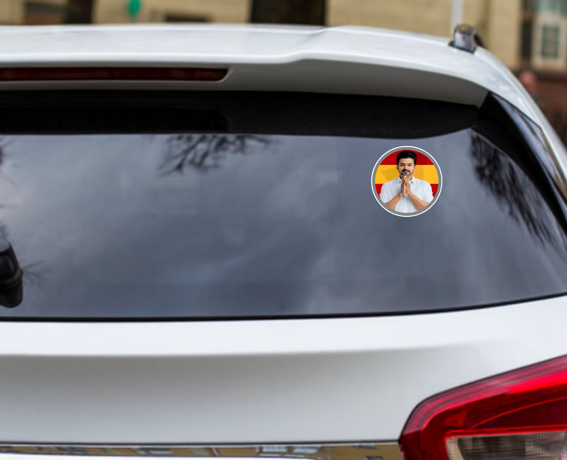 Smeeps TVK Leader Greetings Sticker – 11.43 x 11.43 cm Round Vinyl Decal | Greeting Pose with Red–Yellow Background | Waterproof & Durable