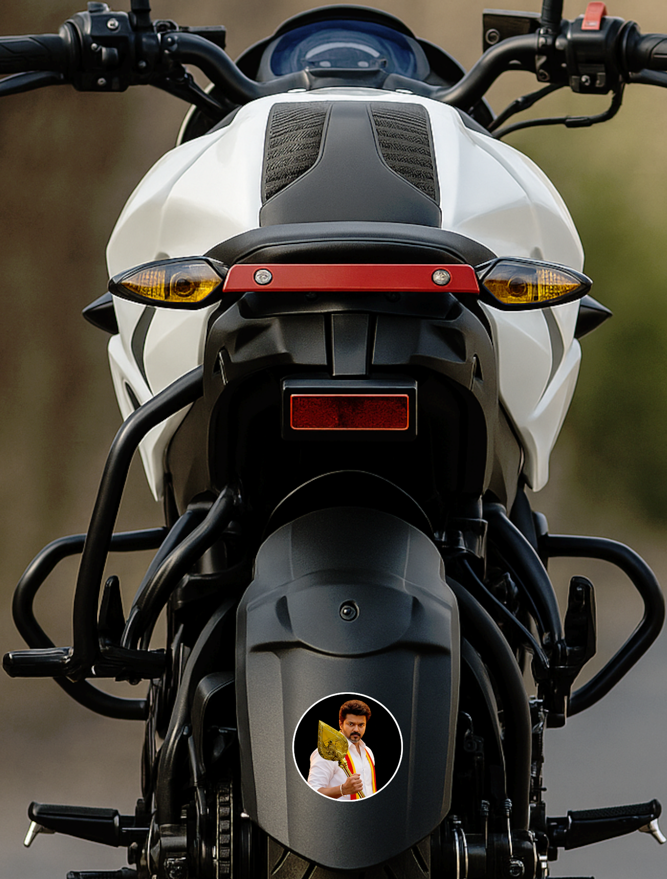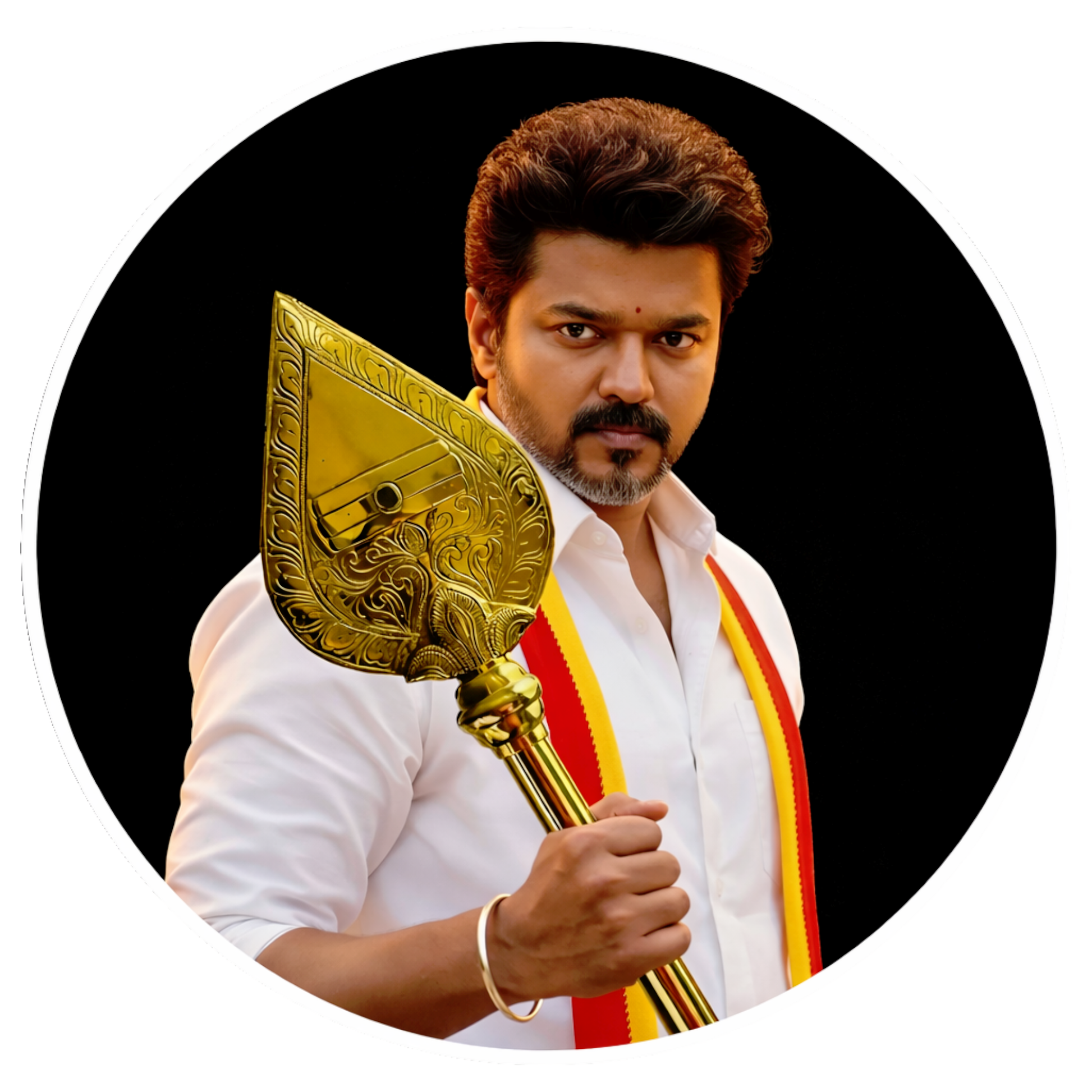 POWERFUL VIJAY VEL STICKER DESIGN – Features a bold circular sticker with a deep black background and a striking image of Vijay holding a golden Vel, creating a strong and commanding visual impact.