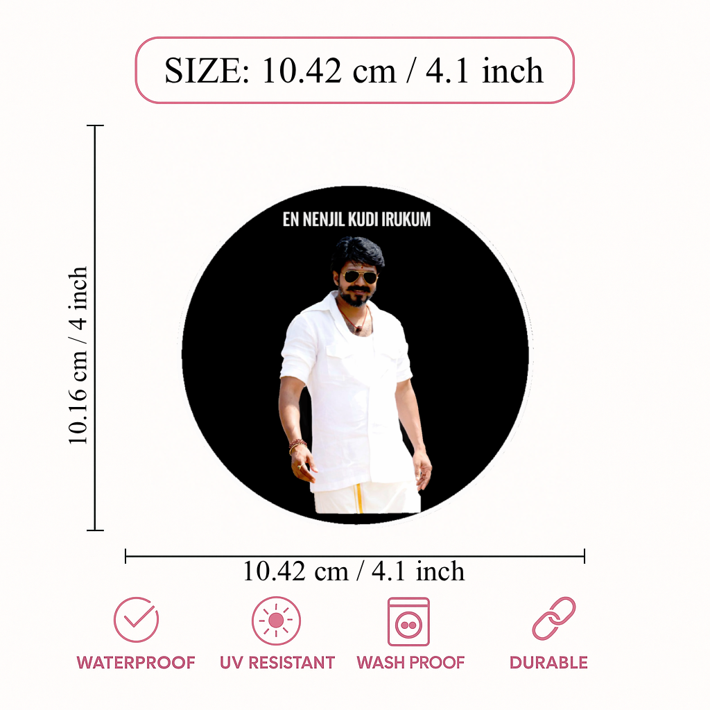 STYLISH VIJAY WALKING POSE DESIGN – Features a bold circular sticker with deep black background, Vijay’s classic walking pose wearing sunglasses, and the iconic dialogue text “EN NENJIL KUDI IRUKUM”, giving a stylish and confident fan appeal.