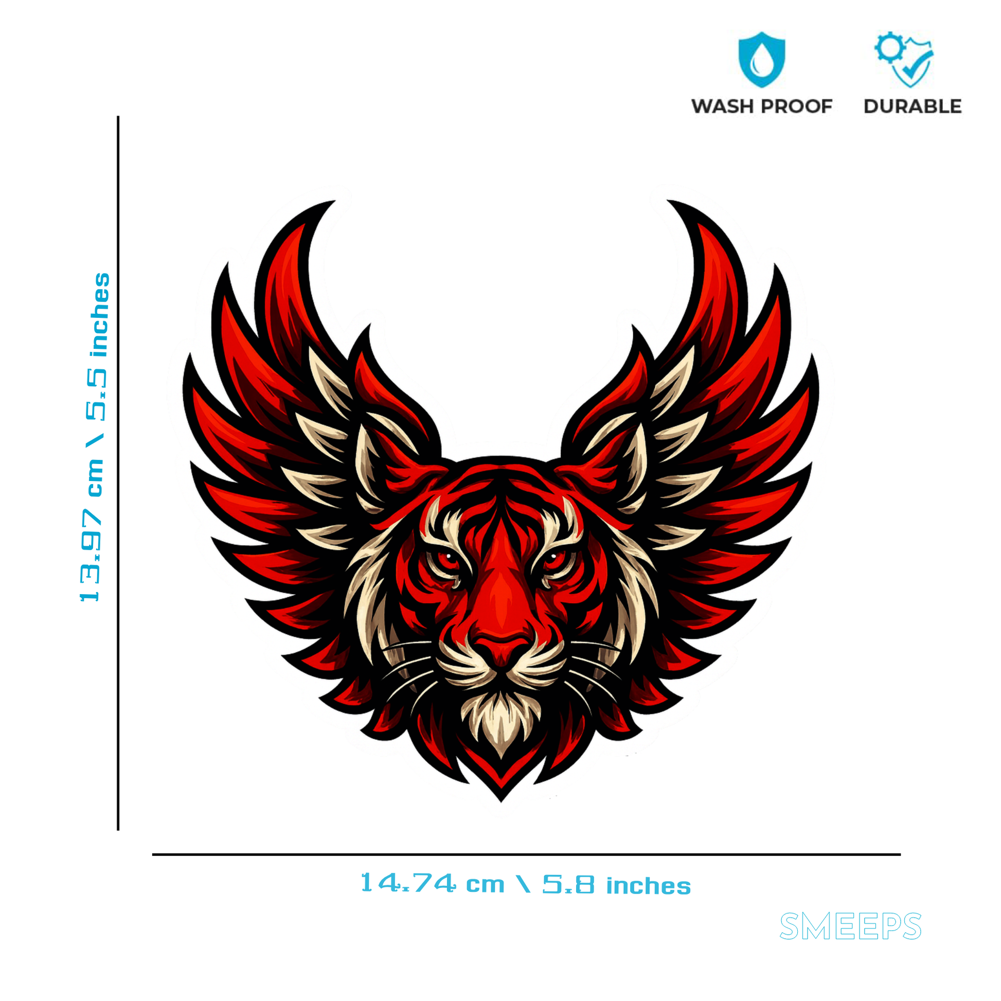 Smeeps Winged Tiger Sticker – 13.97 x 14.74 cm Car & Bike Vinyl Decal | Majestic Red Tiger Head with Wings | Waterproof & Durable Design